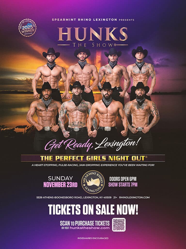 Sunday, November 23rd The perfect girls night out – a heart-stopping, pulse-racing, jaw-dropping experience Doors open at 6PM • Show starts at 7PM • 21+ Only Tickets available at hunkstheshow.com